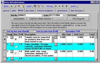 APSWin Bid Solicitation Management lets you automate vendors, commodities, bid lists, bid solicitations, amendments and bidder response. Benefits include: Ø Includes the APSWin Vendor Management module for managing vendors, commodities and bid lists. Ø Maintain department and buyer information that can be quickly included in bid solicitations. Ø Maintain standard text of commonly used terms and phrases that can be quickly included in bid solicitations. Ø Prepare and track bid solicitations, including status, referenced bidders and selected bidders, items, and amendments. Descriptive information can be spell checked and merged with standard text. Ø You have several choices for sending the bid solicitation document. You can print hard copies on your printer or create HTML, PDF and word processing (RTF) documents that can be posted to a web site, emailed, or faxed to bidders. You can use the document formats included with APSWin or customize your own using the supplied templates. |